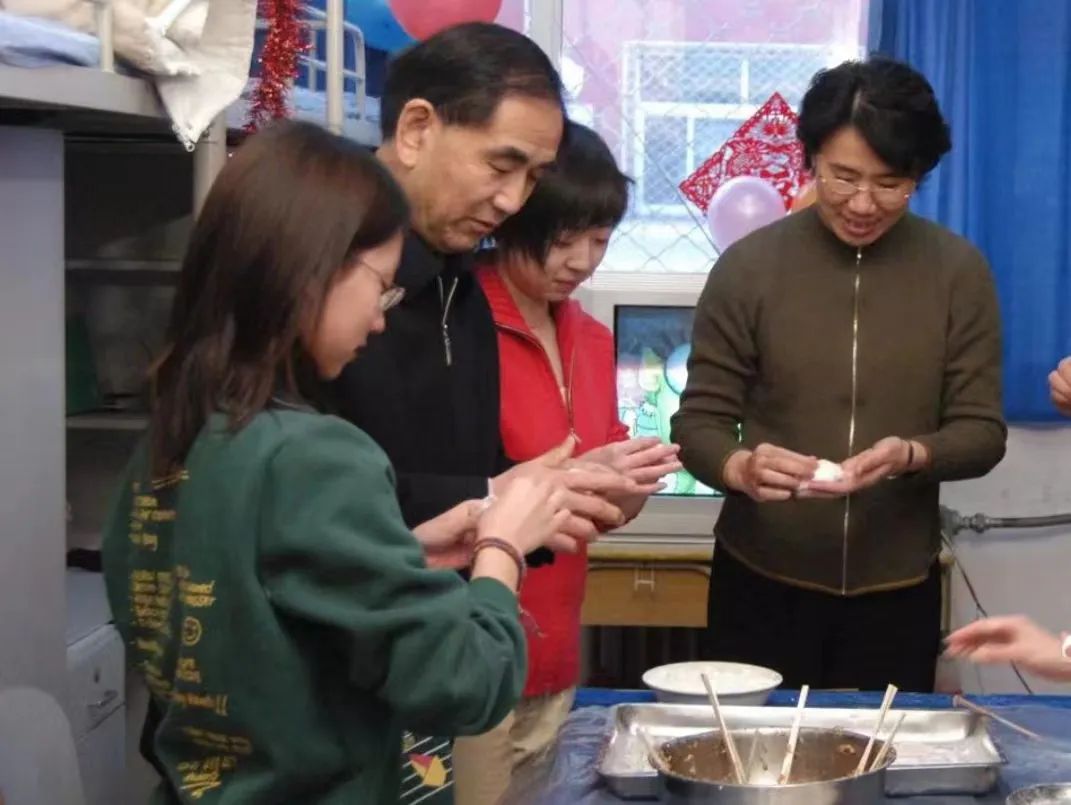 2005年除夕校領導李秀生、吳小林與留校學生在潤杰宿舍包餃子。