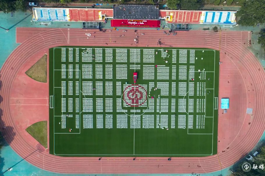 在紅旗操場還曾留下中石大師生對建黨百年的深情獻禮。在學校2021年春季田徑運動會上,師生在精彩的團體操方陣表演中通過不斷變換隊形,擺出“100”“1921”“2021”“CUP”等字樣以及“黨徽”等標志,這是對中國共產黨百年華誕的深切祝福,是用行動踐行著將青春獻給黨的鄭重承諾!