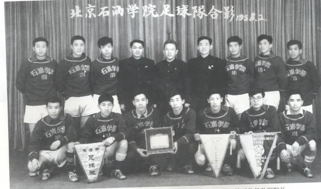 1958年,時任北京石油學院副院長曹本熹、孫卓夫與足球隊合影
