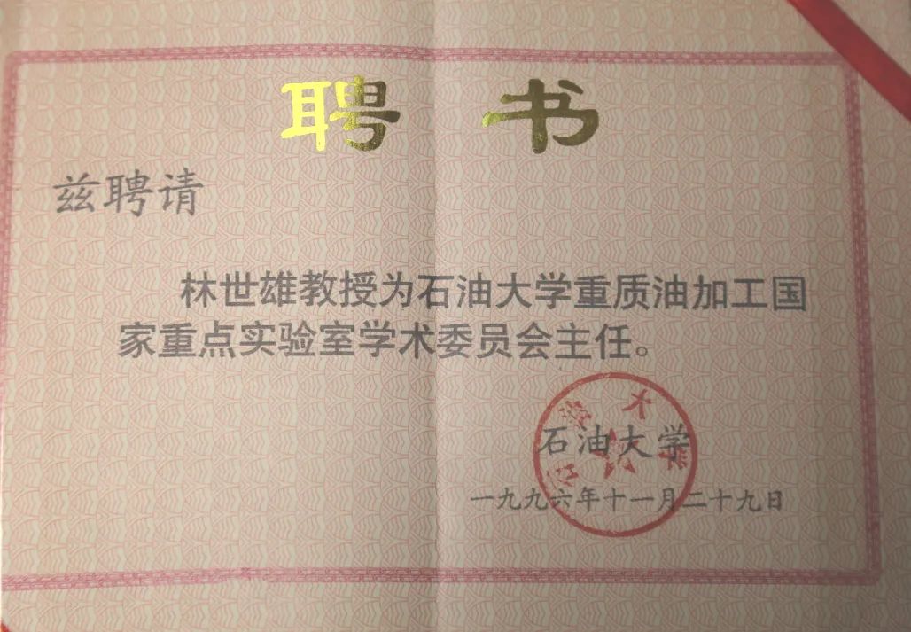 1990年,林世雄被任命為石油大學重質油加工國家重點實驗室首屆主任,受命按照國家標準籌建實驗室,規劃制定、儀器采購、隊伍組建、日常管理……白手起家,舉步維艱,他和參與實驗室首創的師生們嘔心瀝血,起早貪黑,反復論證,充足調研,3年內購置和自制了10多臺(套)必須的儀器設備,初步具備了進行重質油組成結構分析、分離和催化轉化、熱轉化反應研究的實驗條件,自此開啟重質油加工的系統性、創新性研究工作。1995年,實驗室通過國家驗收,正式掛牌成立。