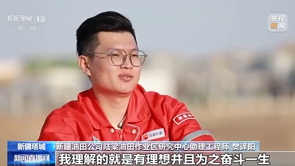 新疆油田公司陸梁油田作業(yè)區(qū)研究中心助理工程師樊譯陽(yáng):這油田是2000年建設(shè)的,我心想我1998年出生的,比它還大兩歲呢,是不是該叫我一聲哥呀。但是來了之后發(fā)現(xiàn)好多老師傅在這一干就是十九年、二十年,駐守這里十年起步的好多,他們把青春都奉獻(xiàn)到陸梁油田所在的這個(gè)沙漠里了。