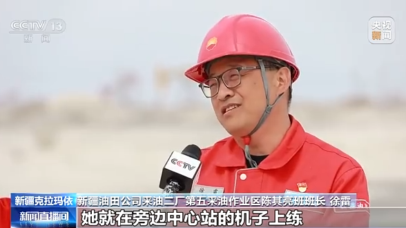 新疆油田公司采油二廠第五采油作業(yè)區(qū)陳其亮班班長(zhǎng)徐雷:每個(gè)工作我們干完之后,我們回中心站該吃飯的時(shí)候我們要去吃飯,吃完飯找不到她了。然后一看,她就在旁邊中心站的機(jī)子上練,能吃苦、能戰(zhàn)斗,這個(gè)就非常欽佩。