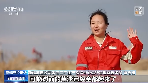 新疆油田公司采油二廠生產(chǎn)指揮中心運(yùn)行管理室技術(shù)員阮思雅:你聽像現(xiàn)在這種風(fēng),在克拉瑪依可能已經(jīng)算是比較小的風(fēng)了,有時(shí)候在五六級(jí)那種風(fēng)的時(shí)候,可能對(duì)面的黃沙已經(jīng)全都起來了,已經(jīng)看不到我們巡檢的路了。當(dāng)時(shí)剛來就覺得,我來了一個(gè)什么地方,習(xí)慣以后就覺得,我們就是這么個(gè)條件,但是已經(jīng)沒有那么難接受了,就覺得掏兩下不就完事了。