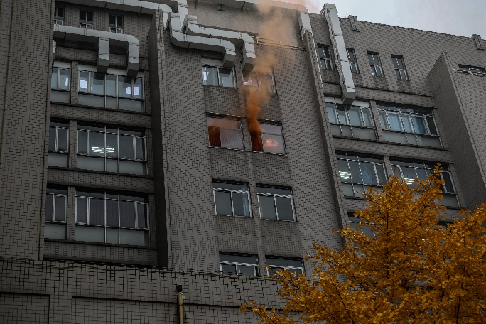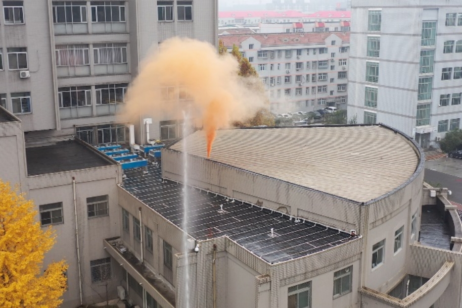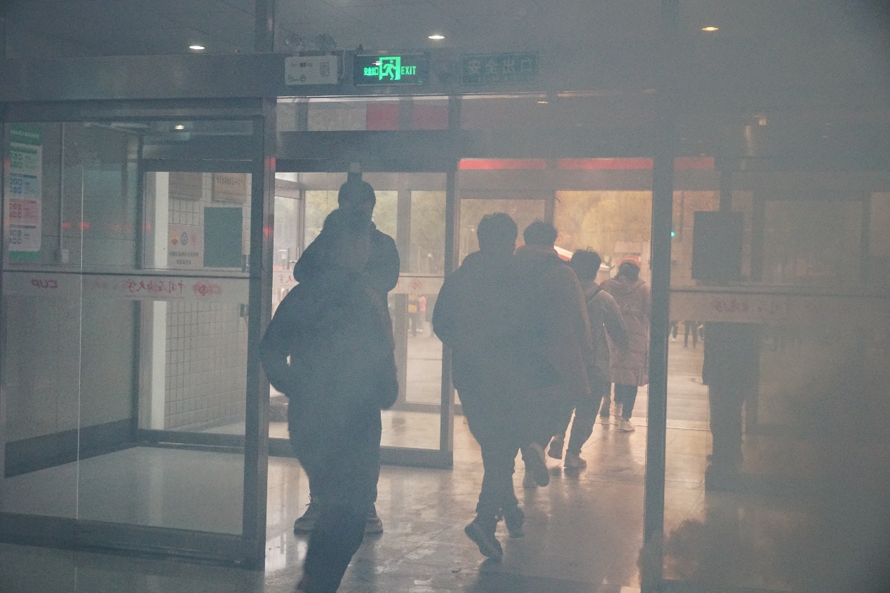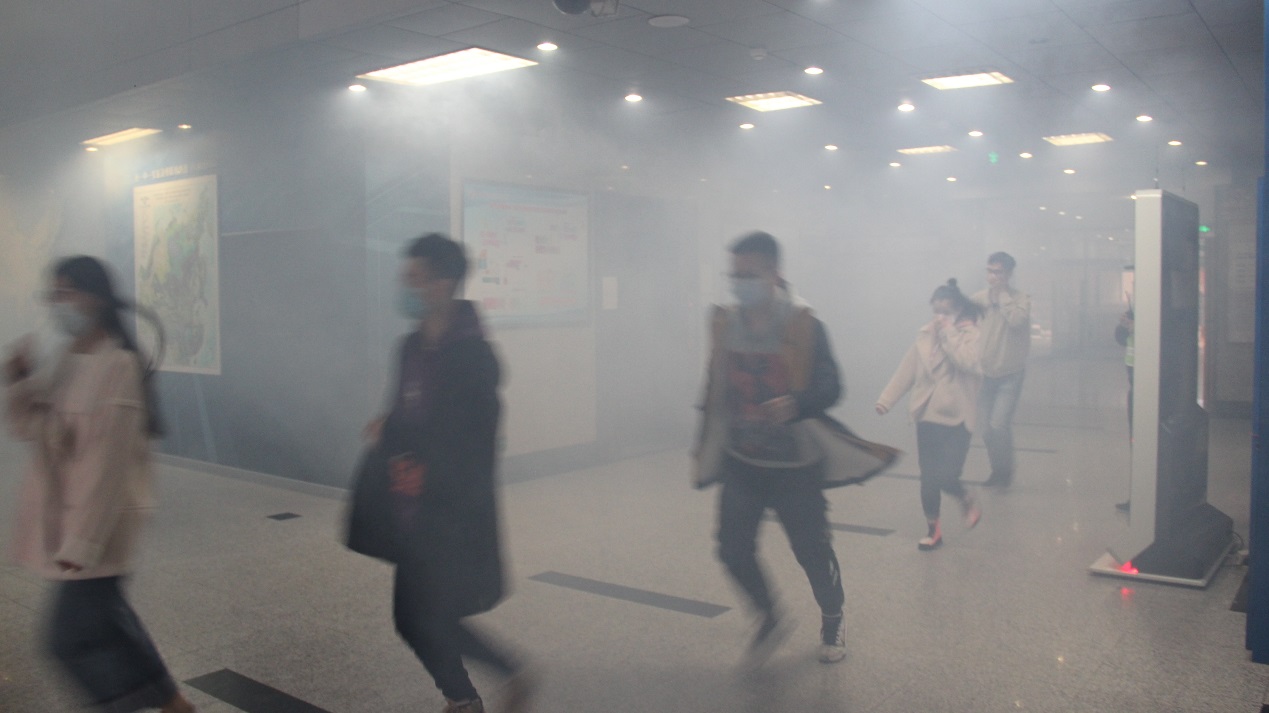 演練現場煙霧滾滾,觸發感煙探測器報警,學校中控室接警確認火情后立即啟動火災應急處置預案,啟動地質樓消防聯動設備,疏散引導組立即打開地質樓所有疏散門,引導組織樓內師生疏散至安全區域集合。