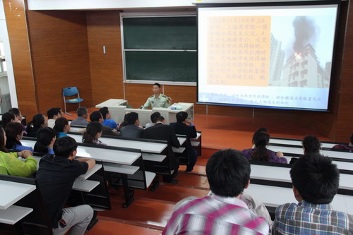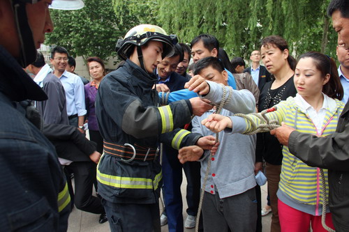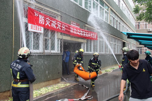 下午14時起,指揮人員一聲號令,演習(xí)正式開始。工作人員點(diǎn)燃煙霧彈,拉響火災(zāi)警報,青年園公寓三號樓頓時濃煙滾滾,“被困人員”用濕毛巾掩住口鼻,在應(yīng)急疏散指揮人員的引導(dǎo)下,快速有序地向樓外安全地點(diǎn)進(jìn)行疏散。搶救小分隊攜帶擔(dān)架迅速進(jìn)入“火場”實(shí)施緊急救援。在室外,三輛消防車及時趕到,消防隊員快速鋪好水帶進(jìn)行模擬救火,整個過程緊張有序。演習(xí)結(jié)束后,消防中隊排長杜崇進(jìn)行了點(diǎn)評,講解了滅火器和逃生繩的使用方法,并指導(dǎo)在場人員進(jìn)行了實(shí)地操作。在隨后的講座中,杜崇結(jié)合自身的工作經(jīng)歷,針對高校的防火特點(diǎn)向大家講解了火災(zāi)的危害、火災(zāi)的預(yù)防、火場逃生自救等知識。