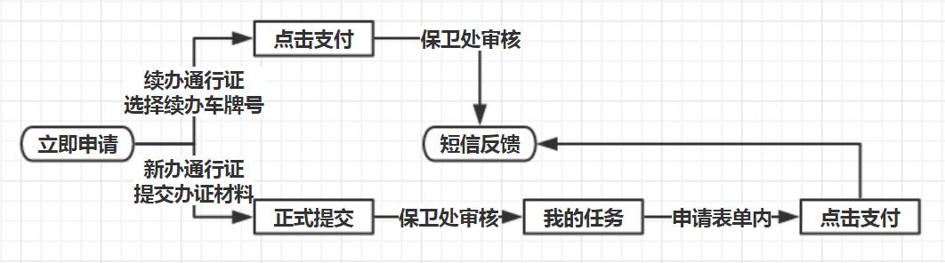 “辦理業務”選擇“新辦通行證”,完善信息并提交辦理材料,由保衛處審核后再繳費。