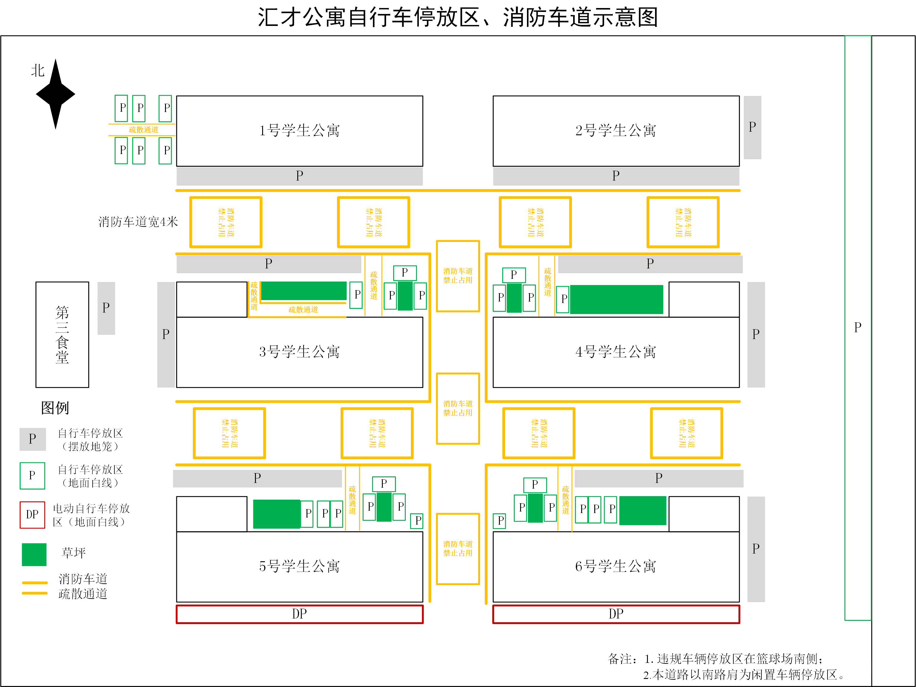 為確保消防通道、救援通道暢通,維護師生生命財產安全,為師生出行帶來便利,保衛處在匯才公寓劃定了自行車、電動自行車停放區(如圖所示),現將有關要求通知如下: