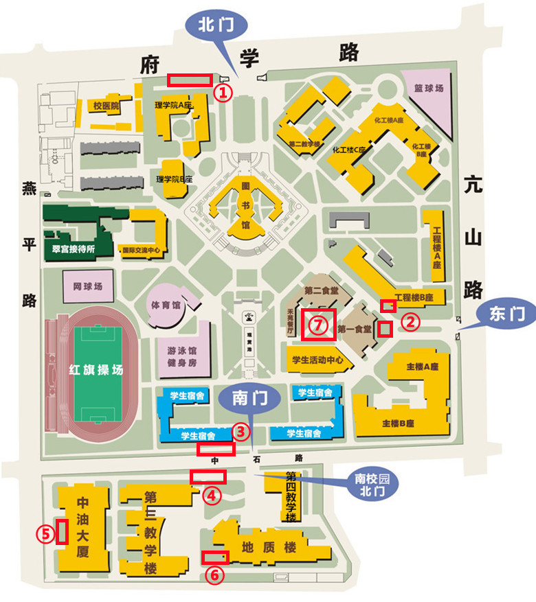 ⑥為南校園地質(zhì)樓西南角停放區(qū)