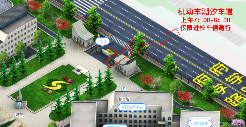 為緩解北校園東門早高峰交通壓力,為師生員工駕車入校提供便利。即日起,將北校園北門原機動車出口更改為機動車潮汐車道。每日上午7:00-8:30,潮汐車道僅限進入校園的機動車通行,出校車輛請走東門;其他時間段,潮汐車道僅限駛離校園的機動車通行,進校車輛請走東門。