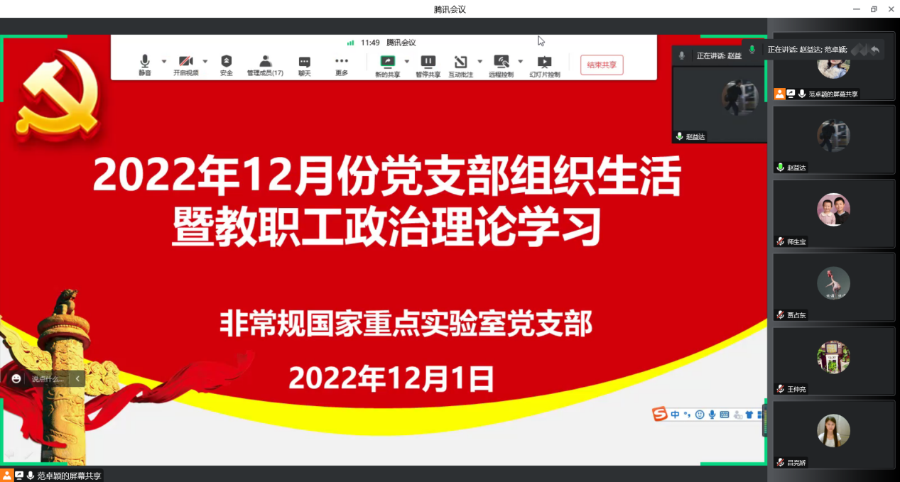 2022年12月1日下午,黨支部組織全體黨員及全體教職工通過騰訊會議線上直播方式,進行政治理論學習以及黨支部組織生活會。