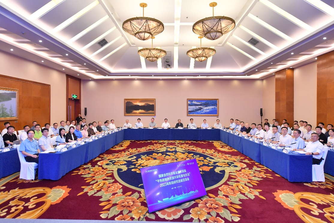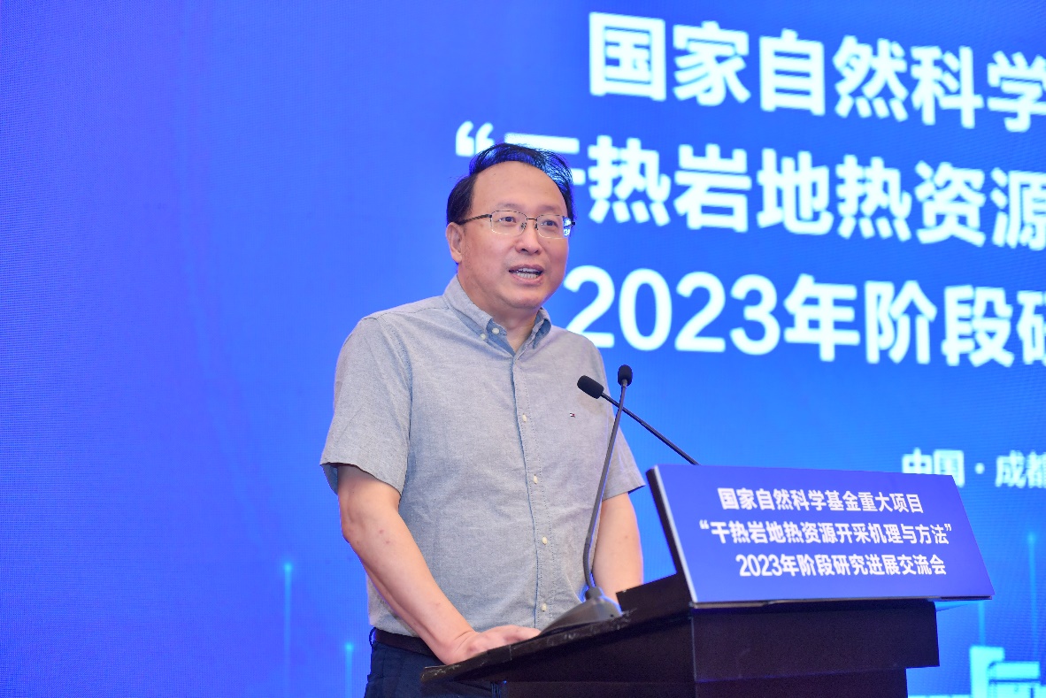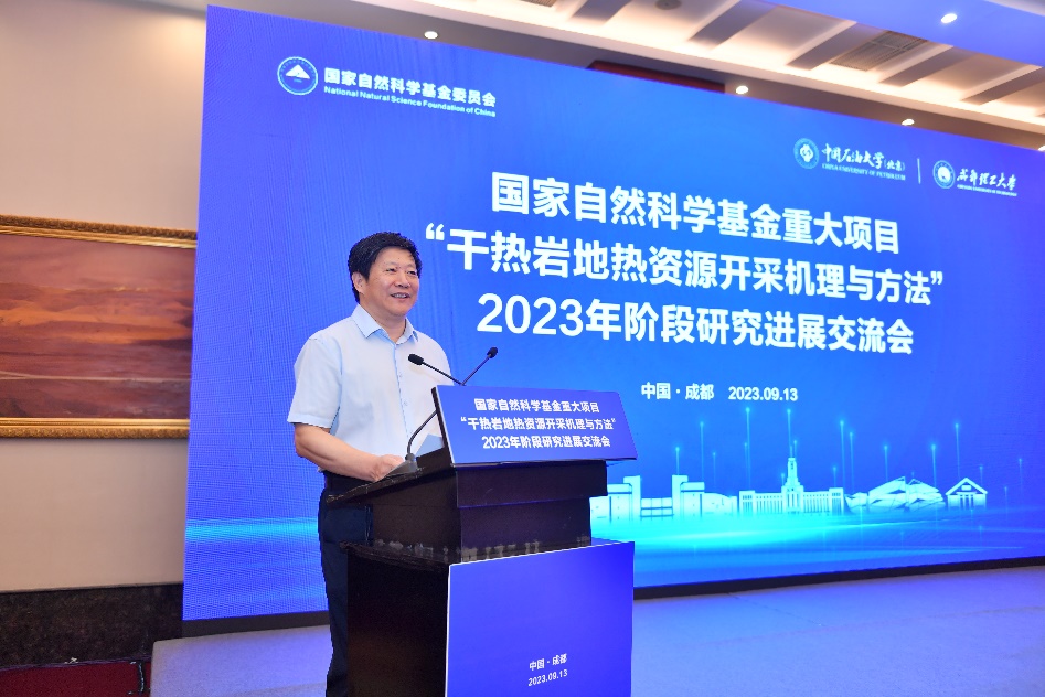 9月13日,國家自然科學基金重大項目“干熱巖地熱資源開采機理與方法”研究進展交流會在成都世紀城會議中心召開。該項目由中國石油大學(北京)牽頭,聯合成都理工大學、深圳大學、中國科學院地質與地球物理研究所和中石化石油工程技術研究院等單位共同承擔。國家自然科學基金委工材學部副主任苗鴻雁、工材學部工程一處項目主任王西勃等,羅平亞院士、謝和平院士、多吉院士、李根生院士、楊春和院士、孫煥泉院士、張來斌院士以及成都理工大學校長劉清友等20余位專家領導出席此次會議,各課題相關負責人和項目骨干成員參加會議。本次會議由中國石油大學(北京)主辦,成都理工大學承辦。項目負責人李根生院士主持會議。
