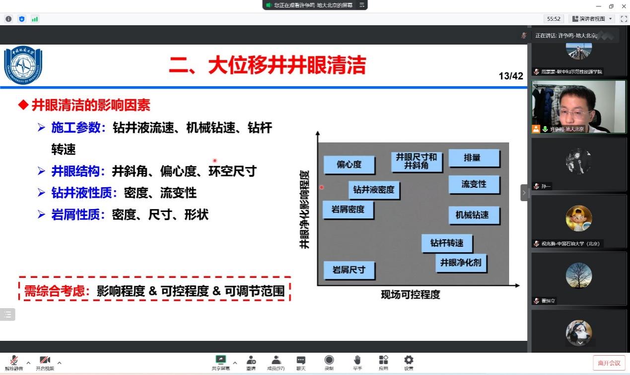許爭鳴副教授首先介紹了大位移井技術背景,他提到大位移井技術是全球油氣勘探開發由淺層向深層/特深層,常規油氣向非常規油氣,淺灘向深海轉變的重要方式。其中包括如何通過大位移鉆井技術更好的維護國家油氣資源主權的部分很好的調動了同學們的學習熱情。同時,許爭鳴副教授還提出在大位移井技術中如何判斷井眼清潔,從“實驗鉆井”和“實際鉆井”兩個角度介紹了判斷標準,并從鉆井液流速、鉆柱轉速、井斜角三個方面討論對巖屑運移的影響,給同學們提供了一些新思路。