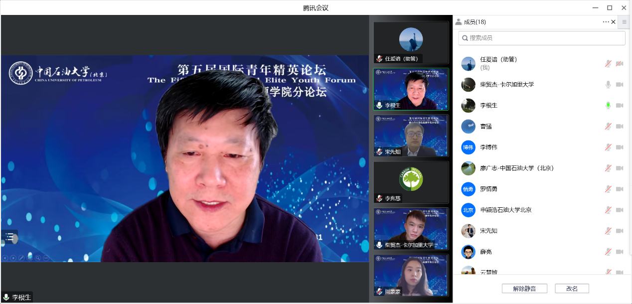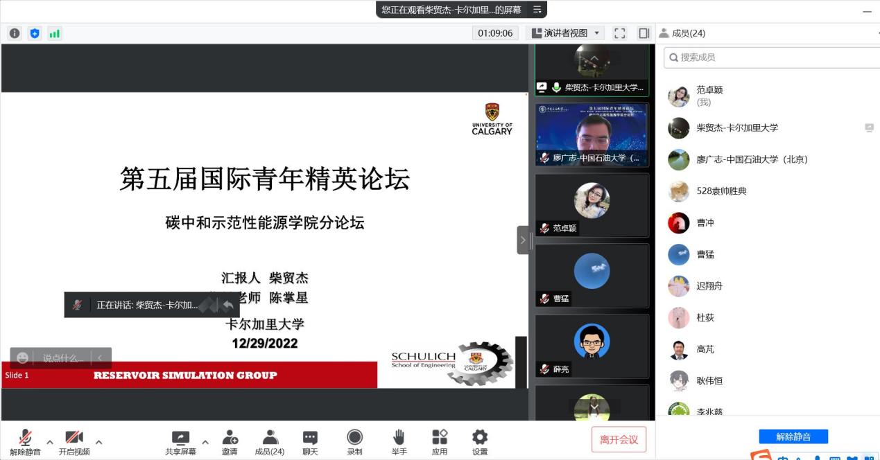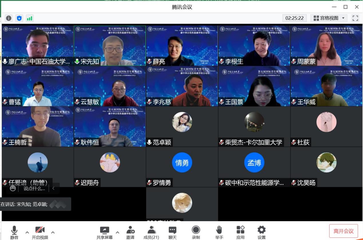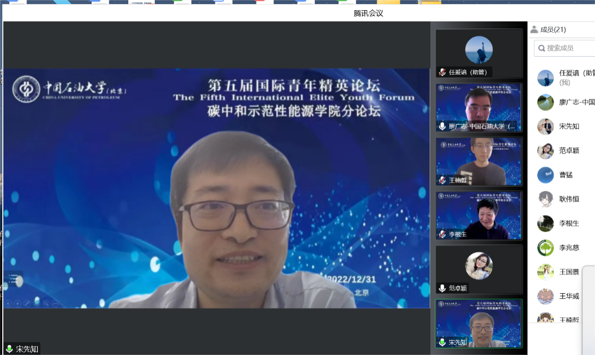 第五屆國際青年精英論壇碳中和示范性能源學院分論壇于2022年12月31日以線上會議方式在京舉辦,碳中和示范性能源學院院長李根生院士,執行院長宋先知,副院長李兆慈、申潁浩、廖廣志、羅情勇、薛亮,青年教師代表周蒙蒙、楊韻,學院相關人員和十位海內外青年學者等二十余人參加會議。會議由學院執行院長宋先知教授主持,學術論壇和交流環節由廖廣志副院長主持。