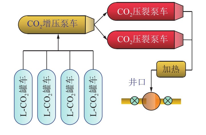 與傳統的高壓氣體爆破致裂技術不同,超臨界CO2聚能壓裂技術在利用高壓超臨界CO2動態致裂 儲層的同時,配合“聚能沖擊+油套同注”等工藝方式可實現高壓超臨界CO2多次、連續注入,從而克服傳統水力壓裂準靜態加載裂縫單一、高壓氣體爆破致裂動態加載裂縫規模小等問題,使儲層產生一定規模且不受地層應力控制的裂縫網絡,具有無水、環保、安全、高效等技術優勢。超臨界CO2聚能壓裂技術有望在高效改造煤層的同時實現CO2的地質埋存。該方法通過地面泵車向帶有特定聚能工具的壓裂管柱內持續泵注可壓縮的超臨界CO2流體,當管柱內壓力超過工程設計壓力時,在壓力作用下聚能工具泄流通道自動打開,高壓超臨界CO2可控沖擊波迅速沖擊致裂煤體,持續注入CO2直至設計用量,驅動原生裂縫和致裂裂縫持續向前擴展,進而在煤層形成具有一定范圍的改造區域。為確保注入目標層位的CO2處于超臨界態,需要在井口配備加熱設備對CO2進行加熱。