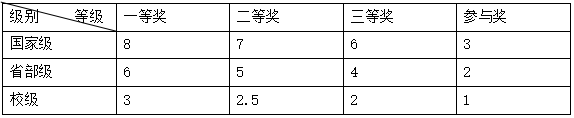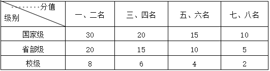 注:特等獎(jiǎng)與一等獎(jiǎng)按一、二名加分,一等獎(jiǎng)按三、四名加分,二等獎(jiǎng)按五、六名加分,三等獎(jiǎng)按七、八名加分。