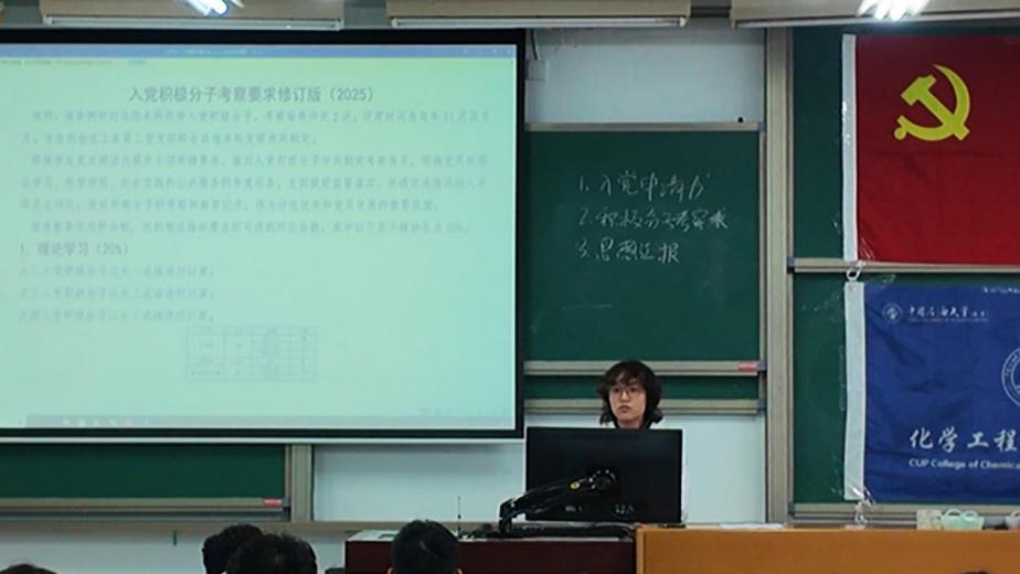 為進(jìn)一步規(guī)范黨員發(fā)展程序,切實(shí)提高新發(fā)展黨員質(zhì)量,加強(qiáng)對(duì)入黨積極分子的系統(tǒng)培養(yǎng)與教育引導(dǎo),10月23日下午,化工學(xué)院全體本科黨支部于三教315聯(lián)合組織開展2025年入黨積極分子基礎(chǔ)培訓(xùn)。本次培訓(xùn)聚焦思想淬煉、入黨流程、文書規(guī)范與管理培養(yǎng)四大核心模塊,旨在引導(dǎo)學(xué)員端正入黨動(dòng)機(jī)、夯實(shí)思想根基、明晰入黨路徑、踐行實(shí)踐要求。