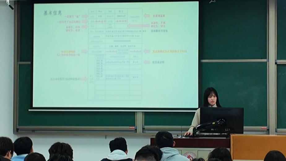 “規(guī)范入門——入黨文書的寫作要求”部分,環(huán)工本科黨支部學(xué)生書記王文紫瑤系統(tǒng)講解了入黨申請(qǐng)書、思想?yún)R報(bào)、群眾調(diào)查意見、政治審查函調(diào)及自傳等核心文書的書寫格式與內(nèi)容要點(diǎn)。能化本科黨支部學(xué)生書記鈕纓雪則聚焦《入黨積極分子考察表》,圍繞基本信息、家庭成員、培訓(xùn)經(jīng)歷等填寫項(xiàng)目提供詳細(xì)操作指引,為學(xué)員規(guī)范撰寫入黨材料奠定基礎(chǔ)。