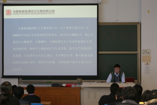 12月8日上午,大唐能源化工有限責任公司招聘宣講會在中國石油大學新綜合樓舉行,大唐能源化工有限責任公司人力資源部主管夏利先生一行8人來我校宣講招聘。