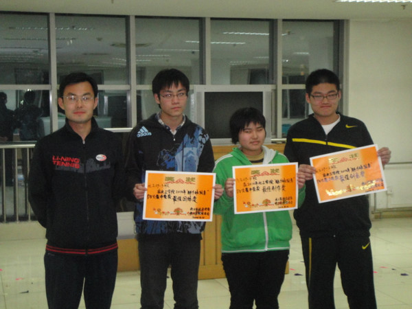 經(jīng)過2個多小時的角逐比賽結(jié)束,化工09-1班摘得桂冠,化工09-4班、化工09-2班分獲團(tuán)體二、三名。本次比賽還評出“最佳創(chuàng)意獎”、“最佳制作獎”和“最佳團(tuán)體獎”。最后,輔導(dǎo)員老師為獲獎班級頒發(fā)證書。