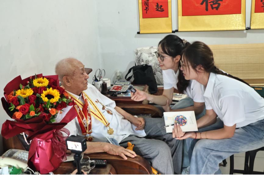 此外,實踐團走訪慰問多名老兵,向為民族解放事業立下不朽功勛的老兵致以崇高敬意和深切關懷;實踐團前往武警某中隊開展交流學習活動,與三名武警官兵進行座談,共話抗戰歷史與家國情懷,近距離感受新時代武警官兵的忠誠與擔當。實踐團與官兵們共同錄制寄語視頻,青年學子的青春誓言與武警戰士的堅守在國境線上交匯,傳遞出“強國有我”的共同信念。