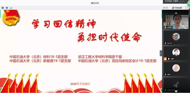 7月23日,中石大新能源與材料學院、克拉瑪依校區文理學院和武漢工程大學材料科學與工程學院聯合舉辦主題團日活動,共同學習習近平總書記重要回信精神。中石大新能源與材料學院材料18-1團支部、新能源19-1團支部,克拉瑪依校區會計19-1團支部,武漢工程大學材料科學與工程學院團委主要團干部以及收到總書記回信的克拉瑪依校區畢業生代表等110余名師生在線參加了活動。