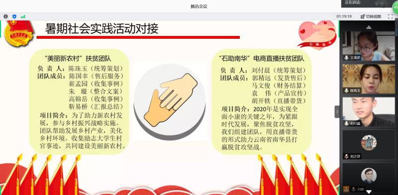 會上還舉辦了武漢工程大學“美麗新農村”扶貧團隊與中石大新能源與材料學院“石助南華”電商直播扶貧團隊暑期社會實踐活動合作對接活動。雙方將以暑期社會實踐為契機,將總書記回信精神落實在行動上,共同為決勝脫貧攻堅、實現全面小康貢獻力量。