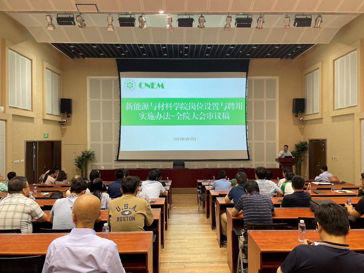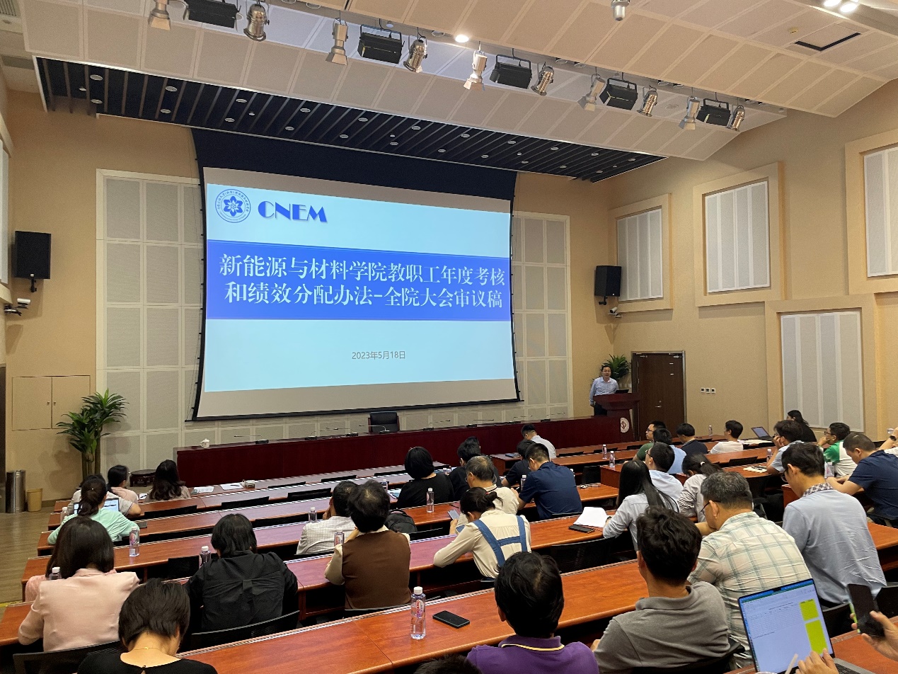 會上,院長李永峰現場解讀了《新能源與材料學院崗位設置與聘用實施辦法(全院大會審議稿)》,詳細介紹了崗位職責與聘用條件、組織機構與聘用程序、聘期與考核管理等文件內容。黨委書記葉海木從考核思路、考核程序、考核等級與結果運用、考核標準與計算方法、年底獎勵性績效工資等方面詳細解讀了《新能源與材料學院教職工年度考核和績效分配辦法(全院大會審議稿)》。李永峰、葉海木分別就教職工們關心關注的問題予以解答。經全體教職工匿名投票,兩稿均審議通過。