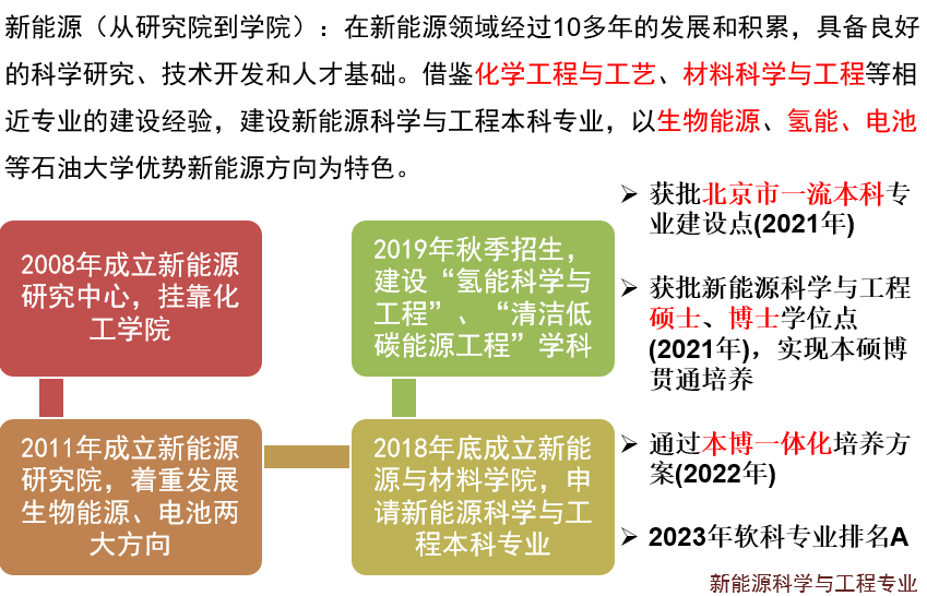 基于對能源行業(yè)發(fā)展趨勢的判斷和思考,中國石油大學(xué)立足國家能源戰(zhàn)略需求和學(xué)科發(fā)展前沿布局,2018年在原新能源研究院的基礎(chǔ)上,成功申辦新能源科學(xué)與工程專業(yè),2019年第一次招收本科生70人。2020年獲批新能源科學(xué)與工程交叉博士學(xué)位點,2021年獲批新能源科學(xué)與工程碩士學(xué)位點,實現(xiàn)新能源方向本、碩、博全方位培養(yǎng)。2021年,新能源科學(xué)與工程本科專業(yè)入選北京市一流專業(yè)建設(shè)點。2022年,通過新能源本博一體化培養(yǎng)方案。2023年軟科新能源專業(yè)排名A。2024年與經(jīng)管學(xué)院合辦能源經(jīng)濟與新能源工程雙學(xué)士學(xué)位專業(yè)。