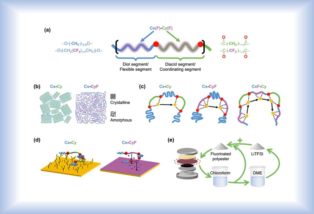 圖1. 該論文設計和研究策略。(a) 不同聚酯的結構設計;(b) 氟化聚酯對結晶度的影響;(c) 不同結構聚酯誘導的不同Li+配位結構和輸運機制;(d) 氟化聚酯對SEI和鋰枝晶形成的影響;(e) 氟化聚酯電解質的回收路線。