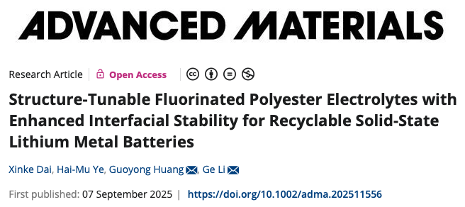 近日,我校新能源與材料學院材料科學與工程專業2022級博士研究生戴鑫柯在材料科學領域國際頂級學術期刊《Advanced Materials》發表標題為“Structure-Tunable Fluorinated Polyester Electrolytes with Enhanced Interfacial Stability for Recyclable Solid-State Lithium Metal Batteries”的學術論文。該論文由我校與加拿大阿爾伯塔大學合作完成,通訊作者為新能源與材料學院黃國勇教授與加拿大阿爾伯塔大學Li Ge教授,我校為論文第一完成單位。