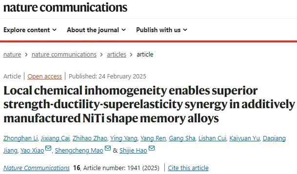 近日,在國家重點研發(fā)計劃,國家自然科學基金支持下,中國石油大學(北京)新能源與材料學院郝世杰教授研究團隊聯(lián)合北京工業(yè)大學毛圣成研究員與同濟大學蕭遙研究員,在Nature Communications期刊發(fā)表題為《Local chemical inhomogeneity enables superior strength-ductility-superelasticity synergy in additively manufactured NiTi shape memory alloys》的研究論文。論文第一作者為新能源與材料學院李仲瀚博士生,北京工業(yè)大學蔡吉祥博士生和同濟大學趙志豪博士生為共同一作,中國石油大學(北京)為第一完成單位。