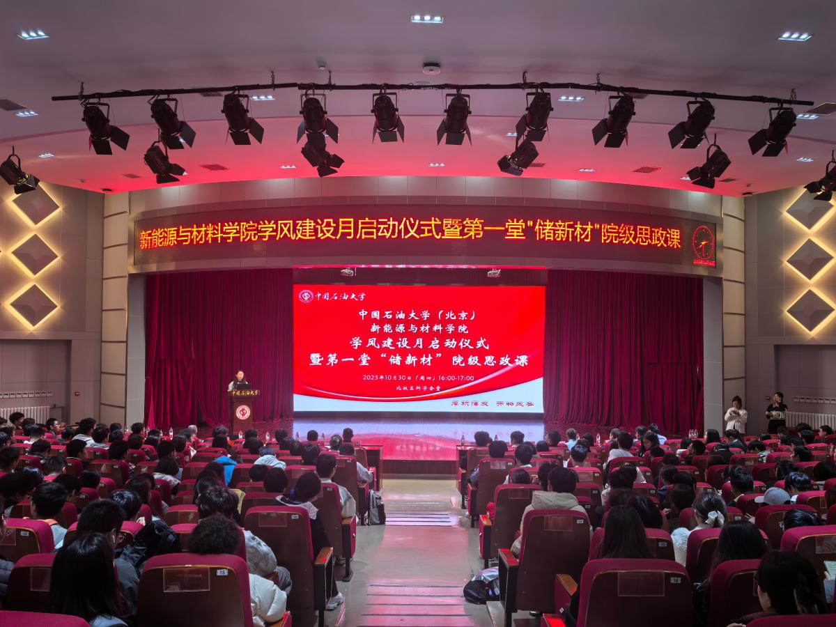 2025年10月30日下午,新能源與材料學院在北校園科學會堂舉行“新能源與材料學院學風建設月啟動儀式暨‘儲新材’院級思政課”。學院黨政領導、各系負責人、教師代表及全體新生共同參加了本次活動。正式拉開本學年學風建設月序幕,深入推進“學在中石大”行動計劃。
