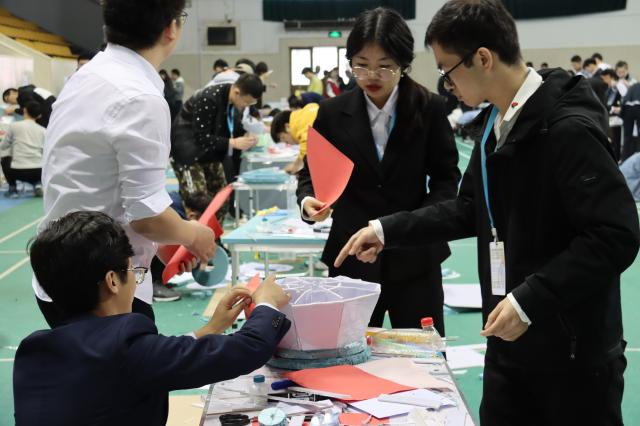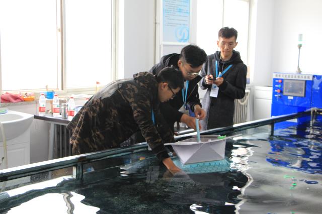 19日上午,新概念浮體模型制作環節準時開始。各組選手靈活運用自身所學專業知識,使用給定的各種制作材料和工具,制作出一個個外觀精美而又形態各異的浮體模型。隨后,各校隊伍參賽浮體模型均測量稱重,并送至中國石油大學(北京)東校區實驗樓進行造波試驗,以測試浮體模型的裝載能力及穩定性。