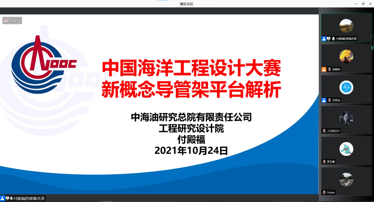 10月24日,由中國海洋工程設計大賽組委會主辦的第三屆中國海洋工程設計大賽賽題解讀會以線上會議的形式順利召開,本次賽題解讀會邀請到中海油研究總院工程設計院副院長付殿福擔任主講嘉賓,會議由大賽組委會工作人員、中石大安全學院團委書記方百會主持,各高校參賽選手和指導老師共計400余人參加了此次會議。