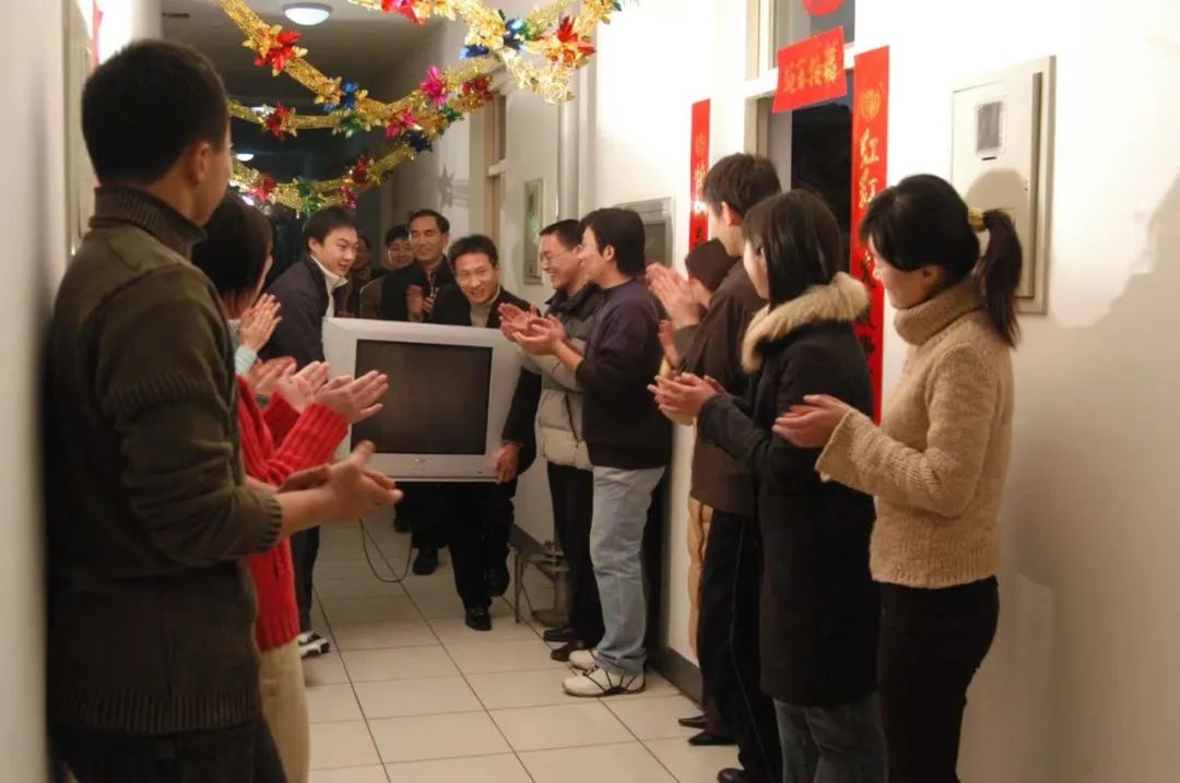 2005年除夕校領(lǐng)導(dǎo)李秀生、吳小林與留校學(xué)生在潤(rùn)杰宿舍包餃子。
