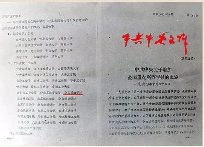 1960年10月22日,中共中央發布(60)868號文件,宣布將全國重點高等學校增加到64所,北京石油學院成為第二批44所重點高校之一,從此躋身全國重點高校行列。