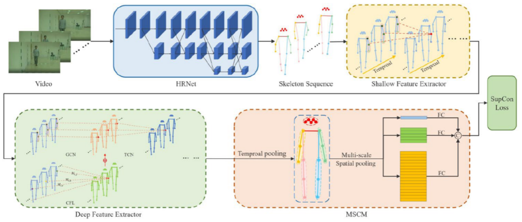 本文將步態視為骨架序列,首先利用輸入姿勢估計網絡HRNet生成骨架步態序列。接著先提取骨架步態序列的淺層特征,再使用協調特征學習器(CFL)提取協調特征與時空特征融合得到深層特征。隨后,深層特征經多尺度級聯模塊(MSCM) 得到關節、肢體和姿勢三個尺度的特征,沿空間維度拼接形成步態特征,最后使用SupCon損失來訓練整個提出的模型。整體架構如圖3所示。
