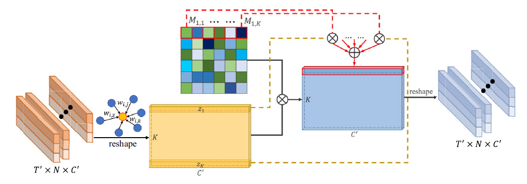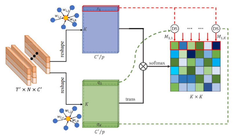 為了捕獲關節之間的協調關系,我們設計了一個協調特征學習器(CFL ),首先計算關節特征之間的點積相似性,并通過softmax函數將它們映射到區間(0, 1),生成一個協調系數向量,如圖4所示。通過連接每個關節的這些向量,得到一個協調系數矩陣。