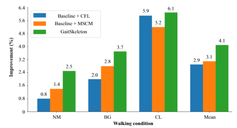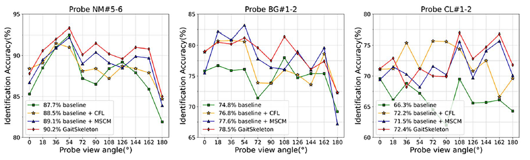 從圖8中可以看出,MSCM在不同條件下持續提高了識別準確率,當MSCM應用于Baseline時,在NM條件下提高了1.4%,在BG條件下提高了2.8%,在CL條件下顯著提高了5.2%。如圖7所示,MSCM提高了幾乎所有角度的識別準確率,特別是在CL條件下大角度(大于或等于90°)的情況下。這主要歸功于MSCM提取的多尺度特征包含更豐富的判別信息,比單尺度特征更有效地捕捉步態模式,并且肢體尺度和姿勢尺度特征分別關注區域和全局運動模式,從而平滑了低質量關節引入的噪音。