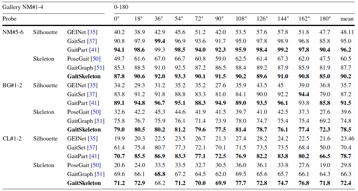 在CASIA-B數據集上表現如表1所示,GaitSkeleton方法能在不同條件(即正常(NM)、背景(BG)和穿著(CL))有效提升步態識別的準確性。與基于模型的方法相比,在NM、BG和CL條件下,GaitSkeleton相比GaitGraph具有2.5%、3.7%和6.1%的識別準確率提升,可以看出GaitSkeleton在BG和CL條件下展現出最顯著的改善。這可以歸因于其減輕外觀影響并提取高度具有區分性和穩健性的步態特征的能力。與基于外觀的方法相比,在CL條件下,相比GaitPart,在在0°、108°和180°角度處,GaitSkeleton分別實現了0.5%、0.8%和5.3%的識別準確率提升。與GaitSet相比,GaitSkeleton在NM和BG條件下的識別準確率較低。然而,在CL條件下,GaitSkeleton超越了GaitSet,在180°處實現了21.8%的最大改善。這些結果突顯了與基于外觀方法相比,GaitSkeleton對服裝和視角的優越穩健性。