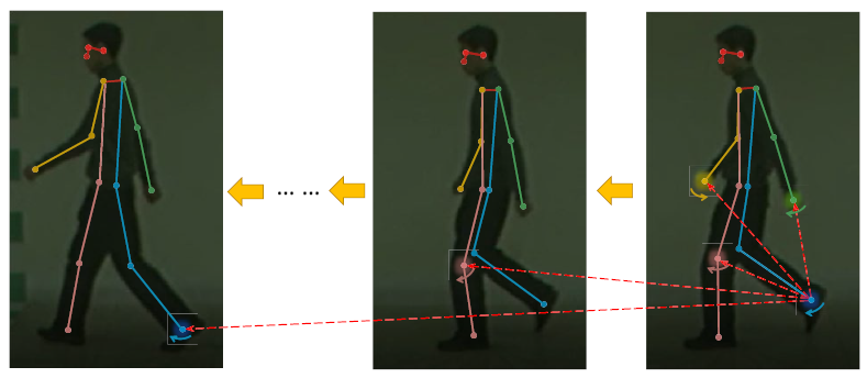 步態識別可以根據個體的行走姿勢來識別個體,具有廣泛的應用領域,如公共安全、犯罪預防和門禁系統。然而,當前大多數步態識別方法存在以下三個問題:(1)使用輪廓圖像作為步態的表示形式,但輪廓信息中包含有關服裝和攜帶物品的細節,存在干擾步態特征的提取的可能性;(2)如圖1所示,關節之間的協調關系是步態識別中重要的區分特征,大多數現有方法忽視了步態的協調信息,導致步態特征的區分能力較弱;(3)個體之間的步態變化呈現多尺度性質,不同個體的關節運動、肢體運動和身體姿勢存在差異,如圖2所示。為此本文提出GaitSkeleton方法,利用骨架序列作為步態的表示形式,同時結合步態協調特征和多尺度步態表征,旨在提取更具區分性的步態特征,從而提高步態識別的準確性和魯棒性。