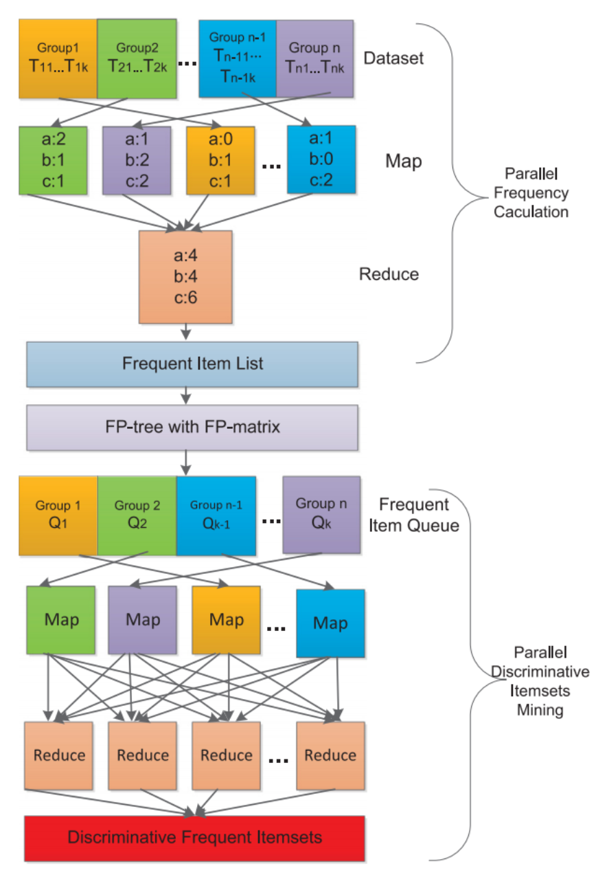 為了應對大規模數據集,本章提出了一種基于頻繁模式的并行化挖掘算法,并將其命名為PFPMine。該算法使用MapReduce框架將前面章節中提出的FPMine算法做并行化處理。圖3為相應的PFPMine總體框架圖。