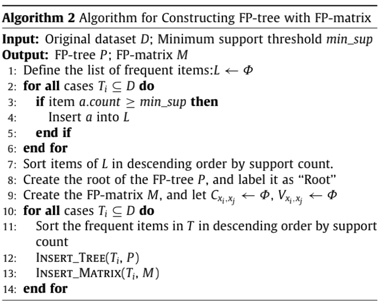 頻繁模式挖掘算法的基本思想是通過遍歷FP樹來查找頻繁項集。為了提高算法的執行效率,本文重新設計了該算法用于查找頻繁二項集,設計了一種新的數據結構,命名為FP矩陣。FP矩陣存儲了每對數據項的頻度信息及興趣度度量值。算法2為FP樹及FP矩陣構造算法。FP樹及FP矩陣如圖2(b)和(c)所示。