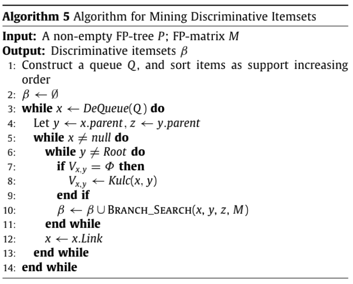 構建了FP樹和FP矩陣,下面將直接挖掘具有區分力的頻繁項集。與傳統的頻繁模式挖掘算法不同,本文提出一種直接挖掘具有區分力的頻繁二項集的算法,關注于挖掘頻繁二項集,而非頻繁模式,這將消耗更少的時間和資源。詳細的頻繁二項集挖掘算法如算法5所示。