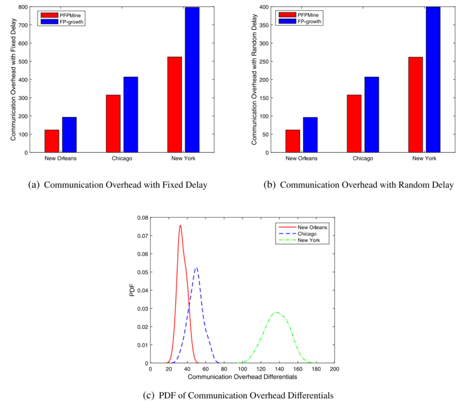 本文采用真實數據集對PFPMine算法進行功能性評估。圖4(a)和圖4(b)為采用PFPMine和FP-growth對三個不同的數據集進行挖掘,并采用上述兩種不同的時延計算通信代價。結果表明采用PFPMine算法的通信代價明顯低于采用傳統的FP-growth算法所計算出的通信代價。