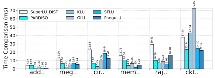 表1展示了幾種稀疏直接法解法器并在圖5中對其數值分解的性能進行了對比。當矩陣規模、矩陣列之間的依賴關系、計算平臺不同時,這些求解器的性能優劣關系都會產生變化。因此結合矩陣特征并充分利用計算平臺來進一步優化LU分解是一個巨大的挑戰。