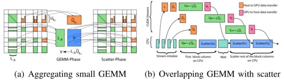 在利用GPU加速計算內核方面,Piyush Sao等人開發了一種將小型密集BLAS操作聚合為一個較大操作的策略(如圖3)。Xu Fu等人在其開發的求解器PanguLU中使用規則的2D分塊策略,將其與決策樹相結合后將部分內核放在GPU上實現相對加速。然而,結合矩陣特征來實現進一步的加速仍然具有挑戰性。