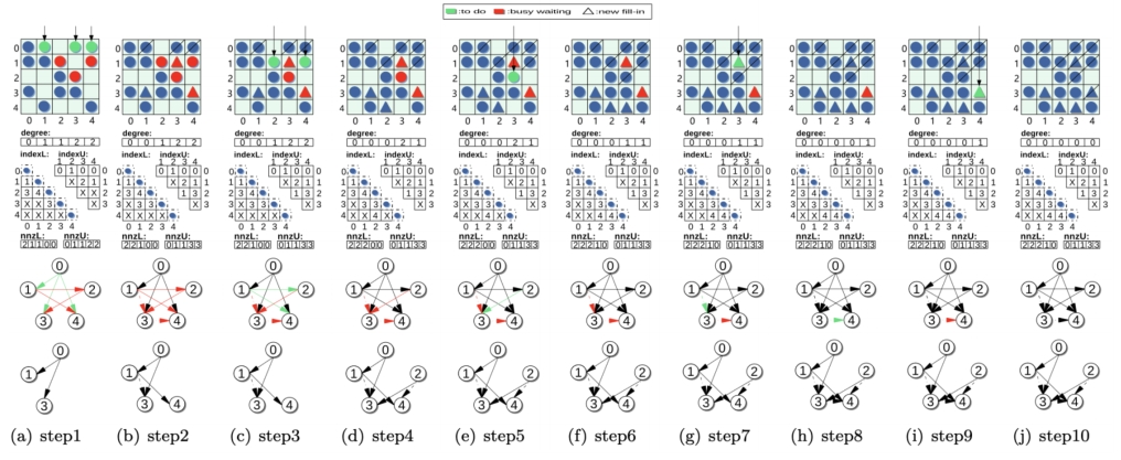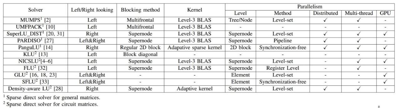 在利用分布式異構平臺進行加速方面,Patrick R. Amestoy等人開發的求解器MUMPS利用異步通信和動態任務調度在Multifrontal方法中進行加速。Xu Fu等人在異構分布式平臺上提出的PanguLU利用多種分塊稀疏BLAS方法來提高GPU的效率、利用無同步通信策略降低總體延遲成本。