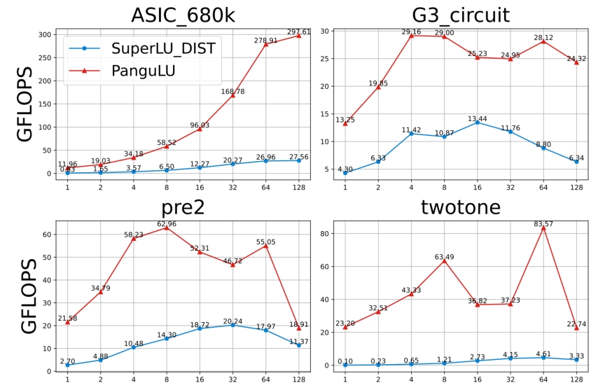 我們進一步對比了在32節點128GPU分布式集群上SuperLU_DIST和PanguLU(如圖6)。雖然分布式方法具有并行加速的潛力,但由此產生的開銷仍不可忽略,利用具有異構處理器的大規模超級計算機提高可擴展性以及降低具有不規則稀疏結構依賴性的進程之間的同步和通信成本仍然是一個巨大的挑戰。