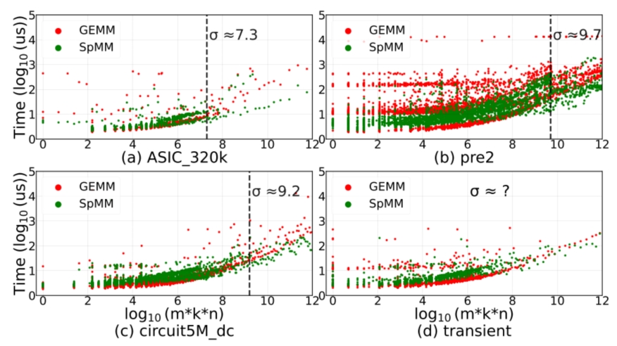 在稀疏LU分解的數值分解階段采用不同類型的矩陣乘法也會產生不同的性能(如圖2)。TengCheng Wang提出了一種配備隨機森林的密度感知自適應矩陣乘法以對不同的子矩陣塊選擇性能最優的矩陣乘法,來加速稀疏LU分解。